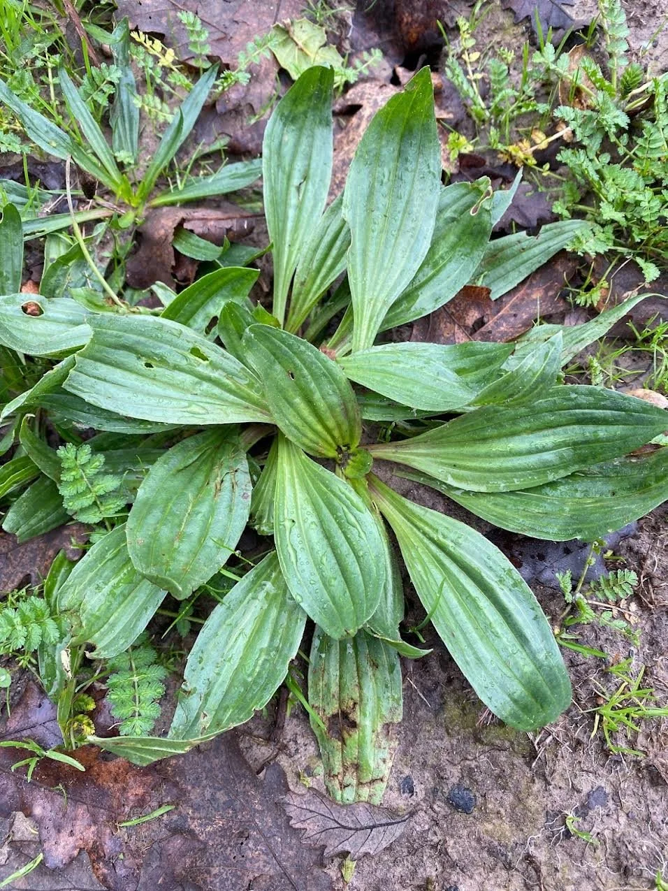 Pictured on right: edible and medicinal plantain leaf (Plantago species). The whole plant is edible. Good for drawing out insect stings as a poultice medicinally.